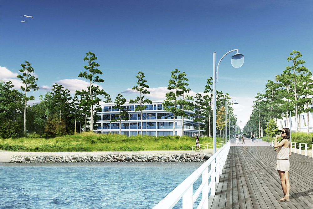 Apartamentowiec usytuowany jest przy molo w Juracie z bezpośrednim widokiem na wodę